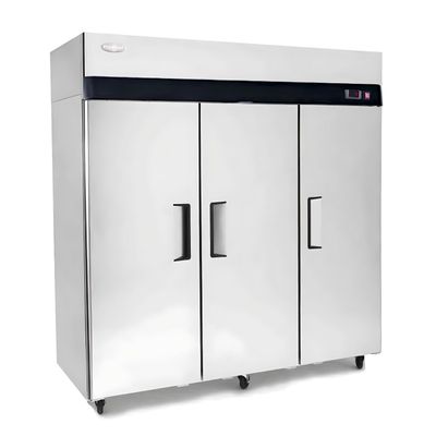 Tiene función dual: se puede programar para mantener alimentos frescos o congelados, ya que trabaja en un rango de -15°C a 5°C. Fabricado íntegramente en acero inoxidable AISI-304 que asegura un alto grado de higiene y protección contra la corrosión y el óxido. Este modelo cuenta con tres puertas y un amplio espacio interior con nueve bandejas de alto tráfico removibles recubiertas en plástico para evitar corrosión. Cada bandeja soporta hasta 88 kilos de carga.