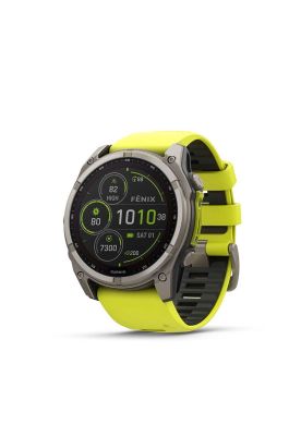 Smartwatch premium multideporte con GPS, carga solar y linterna incorporada | Tipo de producto: Smartwatch | Marca: Garmin | Color: Titanio con correa de silicona amarilla/grafito | Modelo: fenix 8 – 51mm, Solar, Sapphire, Titanium with yellow/graphite | Puntuación de sueño e Insights: Sí | Autonomía de la batería (modo smartwatch: Hasta 30 días (48 días con solar) | Mapas incorporados: Sí | Recomendaciones diarias: Sí | Saturación de oxígeno en sangre mediante el pulsioxímetro: Sí | Linterna LED: Sí | Garmin Pay™: Sí | GPS multibanda: Sí | Almacenamiento de música: Sí | Make calls and send texts via voice: Sí | Predisposición para entrenar: Sí | Training status: Sí | Tipo de pantalla del reloj: Visible a la luz del sol, transflectiva, memoria a nivel de píxeles (MIP) | Carga solar: Sí | Pantalla touch: Sí | Material de la correa: Silicona | Material de los lentes: Power Sapphire™ | Material del bisel: Titanio | Material de la carcasa: Polímero reforzado con cubierta posterior metálica | Diámetro Correa (mm): Se adapta a muñecas de hasta 127 - 225 mm de circunferencia | Peso: 95 g (solo carcasa: 67 g) | Botones inductivos herméticos: Sí | Altavoz/micrófono integrado: Sí | Tamaño de la pantalla (Ancho/Alto): 35,56 mm (1,4") de diámetro | Resolución de pantalla (Ancho/Alto): 280 x 280 pixeles | Pantalla en color: Sí | Opción de fuente grande: Sí | Autonomía de la batería: Reloj inteligente: hasta 30 días/48 días con función de carga solar* Modo reloj de ahorro de energía: hasta 48 días/107 días con función de carga solar* Solo GPS: Hasta 95 horas/149 horas con función de carga solarTodos los sistemas GPS: hasta 68 horas/92 horas con la función de carga solar* Todos los sistemas de satélite y multibanda: hasta 52 horas/65 horas con carga solar* Todos los sistemas de satélite + música: hasta 18 horas. GPS con uso máximo de batería: hasta 186 horas/ 653 horas con función de carga solarModo expedición con GPS: hasta 50 días/ 118 días con la función de carga solar* (* Carga solar, en condiciones de uso durante todo el día con 3 horas al día en entornos exteriores de 50 000 lux; Carga solar, en condiciones de uso en entornos de 50 000 lux; ***Carga solar, en condiciones de uso de 50.000 lux y con un uso normal de la tecnología SatIQ) | Método de carga: Cargador de enchufe exclusivo de Garmin | Memoria/historial: 32 GB | Funciones del reloj: Fecha/hora, sincronización de la hora con el GPS, horario de verano automático, reloj despertador, temporizador, cronómetro, horario del amanecer/atardecer | Control de salud y forma física: Sensor de frecuencia cardiaca en la muñeca, frecuencia cardiaca diaria en reposo, alertas de frecuencia cardiaca anormal, frecuencia respiratoria (24x7), edad fitness, body battery, estrés durante todo el día, temporizador de respiración para relajarse, meditación, sueño, entrenador de sueño, detección de siestas, hidratación, salud femenina, resumen de salud, temperatura de la piel, aviso de Jet Lag | Sensores: GPS, GLONASS, Galileo, QZSS, BeiDou, tecnología SatIQ™, monitor de frecuencia cardíaca de Garmin Elevate™, aclimatación del oxímetro de pulso, altímetro barométrico, brújula, giroscopio, acelerómetro, termómetro, sensor de luz ambiental | Sensor de profundidad: Sí (hasta 40 m) | Conectividad: Bluetooth®, ANT+®, Wi-Fi® | Funciones inteligentes diarias: CONNECT IQ, Connect IQ™ Store en el dispositivo, notificaciones Inteligentes, respuesta de texto/rechazo de llamada telefónica con texto (solo android™), visualización de imágenes de notificaciones en el reloj (solo Android™), informe matutino, calendario, clima, la configuración en tiempo real se sincroniza con Garmin Connect™ para dispositivos móviles, ahorro de energí, control de la música, reproduce música, buscar mi teléfono, función encontrar mi reloj, buscar mi teléfono durante la actividad GPS, compatibilidad con la aplicación Garmin Messenger, control remoto VIRB®, control del rodillo de entrenamiento SMART, compatible con Garmin CONNECT Mobile, valores bursátiles, llamadas telefónicas por BLUETOOTH y compatibilidad con asistentes de voz, comando de voz, Garmin Share | Compatibilidad con smartphone: iPhone®, Android™ | Perfiles de actividad de gimnasio disponibles: Fuerza, HIIT, Cardio, Elíptica de fuerza, Subida de Escaleras, Subida de Pisos, Ejercicios con ergómetro, Comba | Multideportes: Natación/Carrera, Triatlón | Bienestar: Caminar, Caminar en interiores, Pilates, Yoga | Carrera en interiores: Carrera en cinta, Carrera en pista interior, Carrera virtual | Running al aire libre: Carrera, Carrera en pista exterior, Trail running, Ultramaratón, carreras de obstáculos | Perfiles de recreación al aire libre disponibles: Hiking, Escalada en interiores, Escalada en bloque, Escalada, Caza, Equitación, Golf, Disc golf, Tiro con arco | Perfiles de ciclismo disponibles: Ciclismo, Ciclismo de carretera, Ciclismo de montaña, Ciclismo de grava, Ciclismo para ir a trabajar, Cicloturismo, Ciclismo eléctrico, Bicicleta eléctrica de montaña, Ciclismo Indoor, Ciclocross, BMX | Perfiles de natación disponibles: Natación en piscina, Natación en aguas abiertas | En el agua: Paddle surf (SUP), Remo, Kayak, Surf, Kitesurf, Windsurf, Pesca, Navegación, Vela, Esquí acuático, Wakeboard, Wakesurf, Tubing, Snorkel, Aguas bravas | Automovilismo: Motociclismo, Overlanding, Motorcrossing, Todoterreno, Moto de nieve | Deportes de raqueta: Tennis, Pickleball, Bádminton, Squash, Tenis de mesa, Pádel, Platform Tennis, Raquetbol | Nieve e invierno: Esquí, Snowboard, Snowboard de montaña, Esquí de fondo clásico, Esquí de fondo (modalidad patinador), Esquí de montaña, Patinaje sobre hielo, Raqueta de nieve | Perfiles deportivos: Baloncesto, Voleibol, Hockey sobre hierba, Hockey sobre hielo, Fútbol, Fútbol americano, Lacrosse, Rugby, Ultimate frisbi, Críquet, Sóftbol, Béisbol | En el r