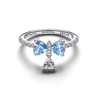 El más bello de los moños. Elaborado en plata esterlina, este anillo inspirado en Bridgerton tiene un delicado moño engastado con cristales azules de ensueño y piedras transparentes y acabado con un delicado detalle colgante.