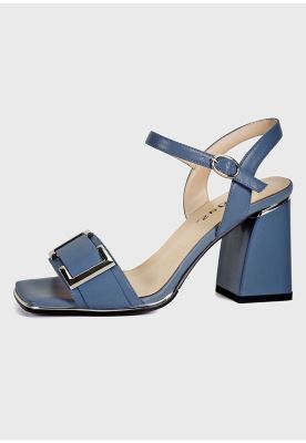 Sandalia de 9 cm de taco, capellada de Cuero con aplicacion metalica rectangular en la punta, plantilla suave y acolchada, ajuste mediante correa por el talon y tobillo con hebilla metalica, taco al tono. Sandalia comoda y versatil.