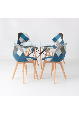 Comedor Mesa Eames Redonda vidrio 80cm + 4 Sillas Eames Patchwork Tela Wood Celeste | Paris