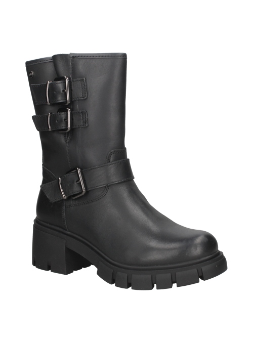 Bota negra de cuero con caña media estilo biker, ideal para combinar con jeans o faldas, correa metálica distintiva.